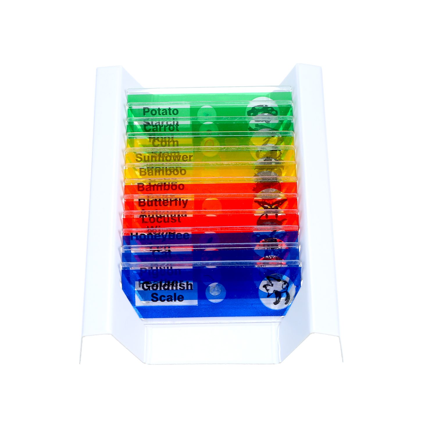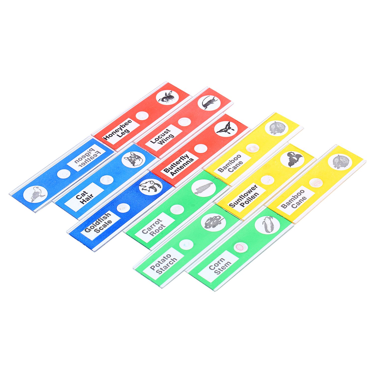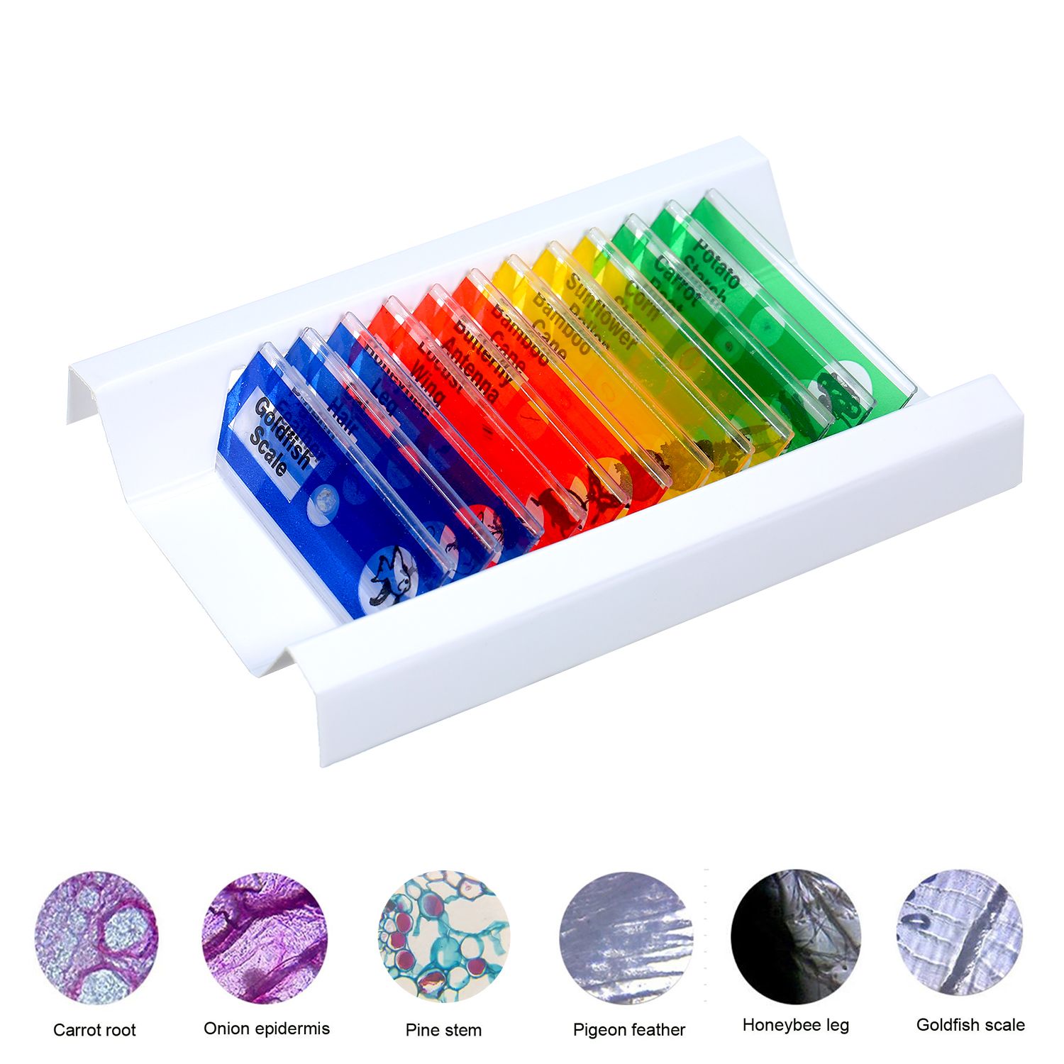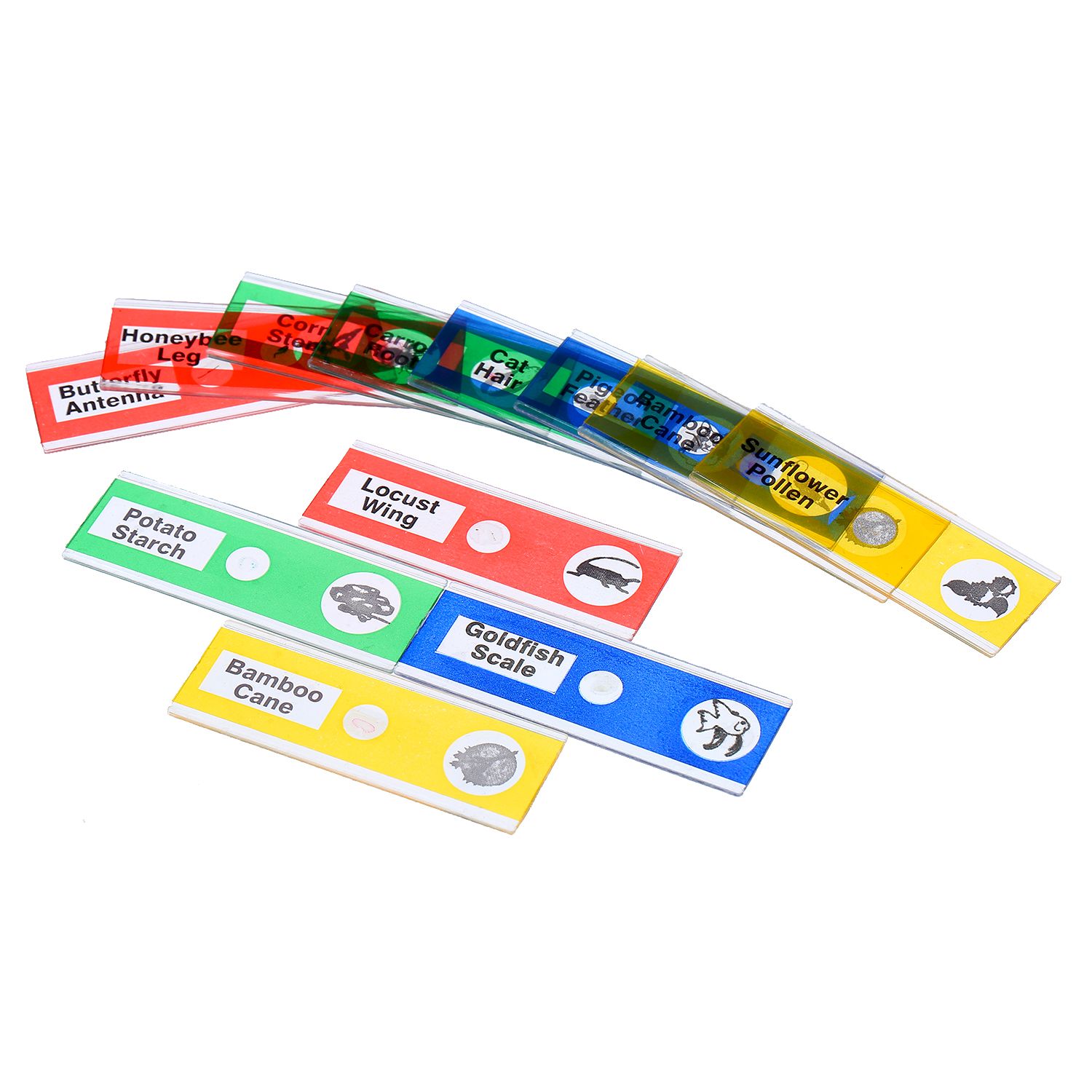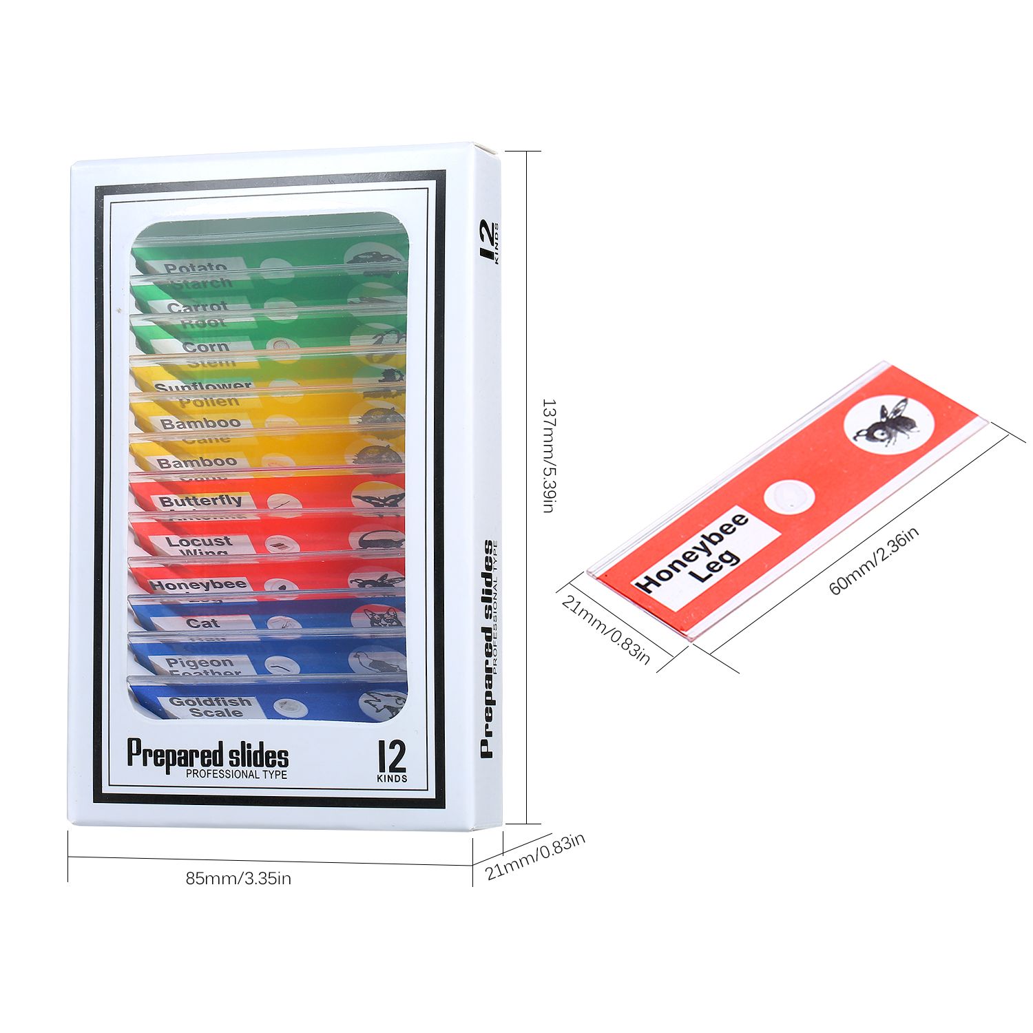 Features:Safe and Reliable --- 12pcs microscope prepared slides are made of plastics there are no sharp edegs will not hurt children.Package Include --- One box with 12 pieces specimens. 3pcs animals hair or feather sample 3pcs insects leg or wing sample 3pcs plants sample 3pcs flowers sample.Easy to Identify --- 12 pieces specimens with different color and mark with image and name for easy classification.Application --- Those 12pcs microscope prepared slides of entomology botany and mammology specimens for kids entry-level students or home school programs.Easy to Use --- It will not break during using and is easy to save.Specifications:Material: ABSQuantity: 12pcs 3 pieces samples for each of animals insects plants and flowers.Slide Size: 6*2.1cm/2.4*0.8inPackage Weight: 150g/5.3ozPackage Size: 16*8.9*2.1cm/6.3*3.5*0.8inPacking List:1 * Box of Prepared Microscope Slides
