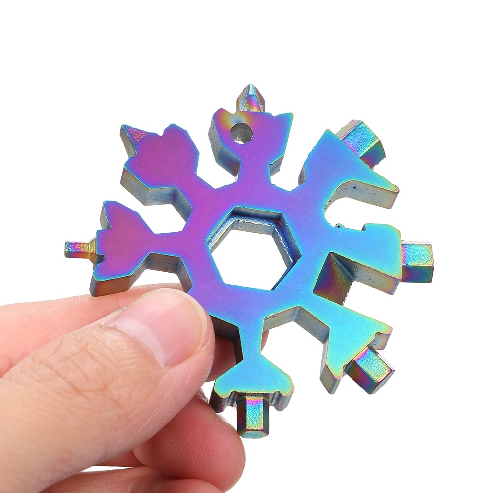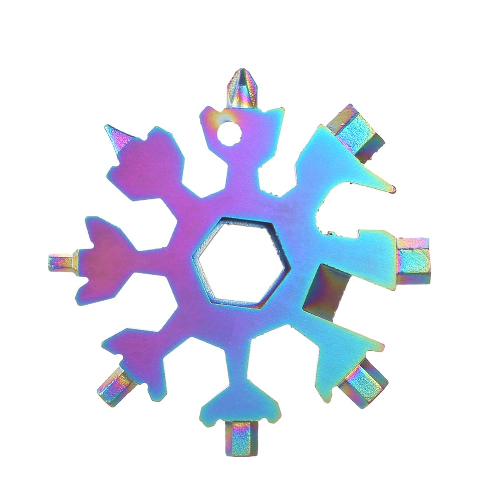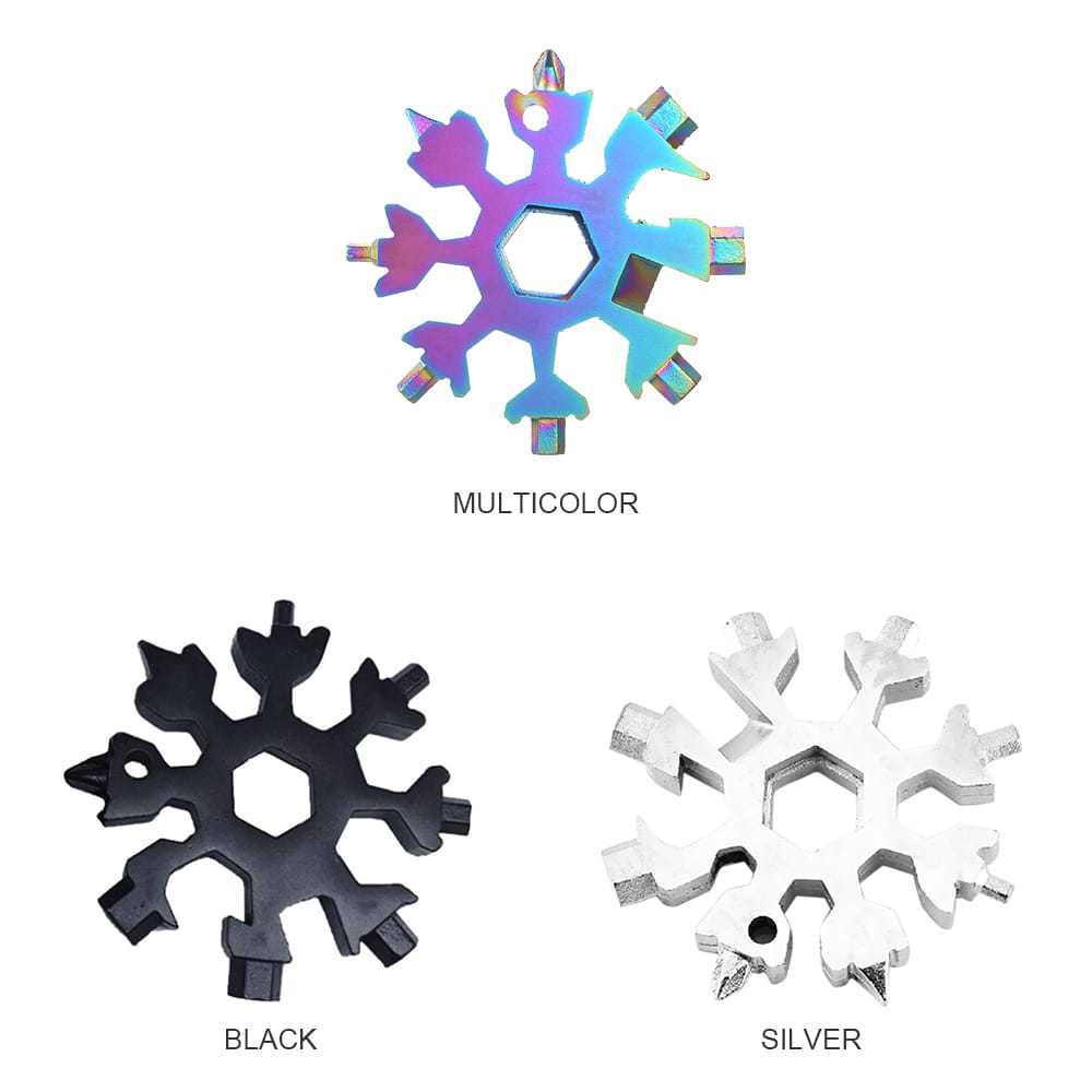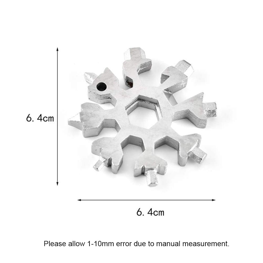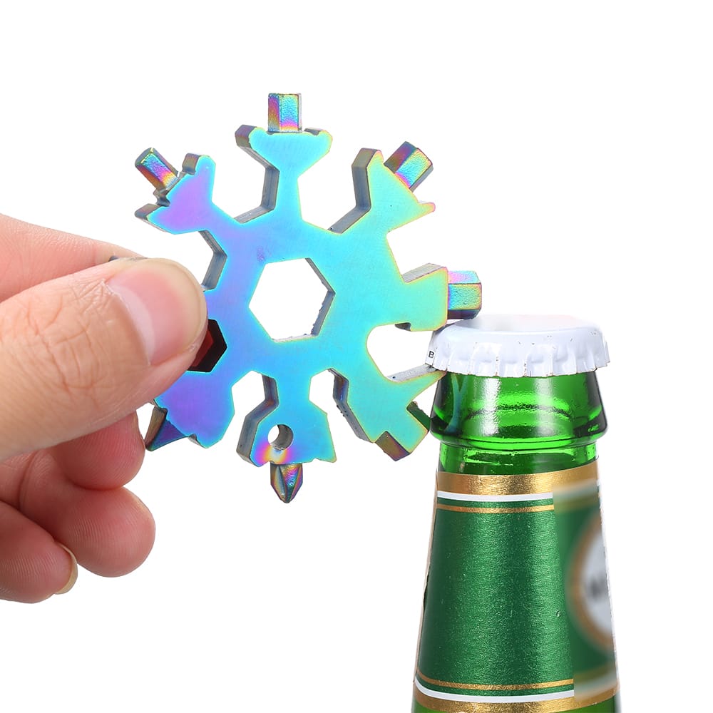 Multi-functional snowflake shaped screwdriver features in incredible multiple tools is a perfect keychain screwdriver bottle opener and inside wrench and necessary for outdoor camping home life.Features:Made from 420 stainless steel exquisite workmanship and long-lasting.Perfect to attach to keychains or backpacks.Unique snowflake design and compact size easy to carry.Suitable for any indoor and outdoor occasions.Stainless multi-tool is an ideal gift for your family or friends.Can be used to open bottles turn screws repair snowboards and bicycles.Specifications:Material: stainless steelShape: snowflakeColor: black; silver; multicolor (optional)Application: inside wrench screwdriver bottle opener keychain and so on.Item Weight: 69g / 2.43ounceItem Size: 64 * 64 * 8mm / 2.52 * 2.52 * 0.31inPackage Weight: 79g / 2.79ouncePackage Size:65 * 65 * 10mm / 2.56 * 2.56 * 0.39inPackage List:1 * Snowflake Tool1 * Key Ring