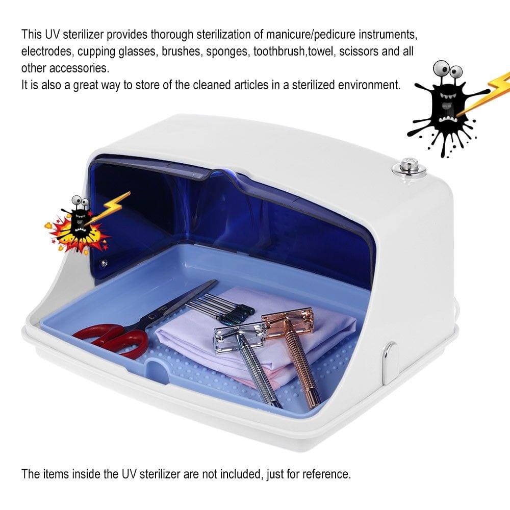 description":"Description: This UV sterilizer provides thorough sterilization of manicure/pedicure instruments, electrodes, cupping glasses, brushes, sponges, scisso and all other accessories. It is also a great way to store of the cleaned articles in a sterilized environment. It is widely used in hair salon, nail beauty salon, sauna shop, hotel, etc. Disinfection easily at any time. Sterilization object: Comb,toothbrush,towel,garment,mobile phone,kitchen supplies,beauty & hair equipment,medical appliances,clinical thermometer,hairpiece,etc. Features: UV sterilizer, flip-type lid, designed for disinfecting and sterilizing. Coated inspection cover, easy to see cabinet items inside. Super UV sterilization, clean, disinfectant and safe. Comes with a plate, convenient and easy to use. Power on/off button, easy & safe to operate. Specifications: Type: Sterilizer Material: ABS Plug: EU Plug; US Plug(Optional) Rated Voltage: 220V-240V Frequency: 50Hz Power: 5W Item Size: Approx. 29.0 * 23.0 * 17.0cm / 11.4 * 9.1 * 6.7in (L * W * H) Item Weight: Approx. 1290.0g / 45.5oz Package Size: Approx. 31.5 * 25.0 * 17.5cm / 12.4 * 9.8 * 6.9in (L * W * H) Package Weight: Approx. 1388g / 49.0oz Note: Please read instruction carefully before using the products. Package List: 1 * Sterilizer Cabinet 1 * Disinfection Plate 1 * User Manual