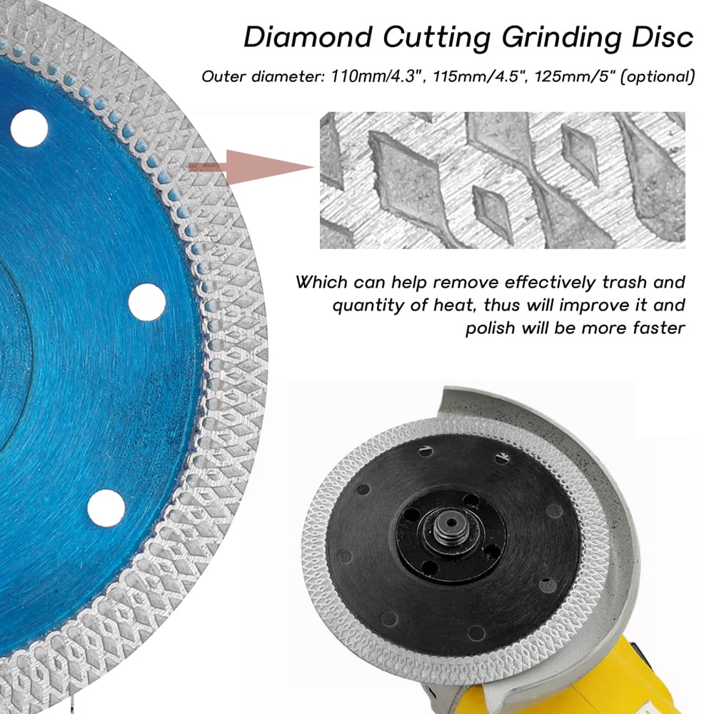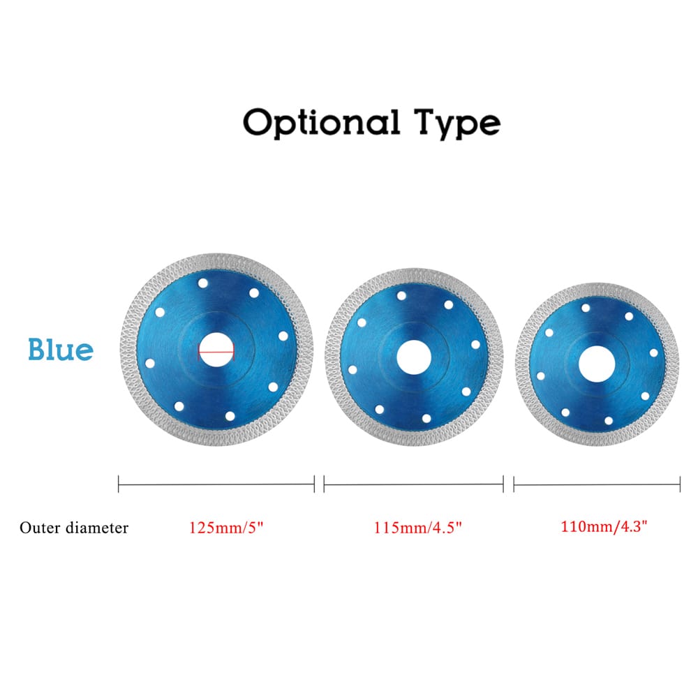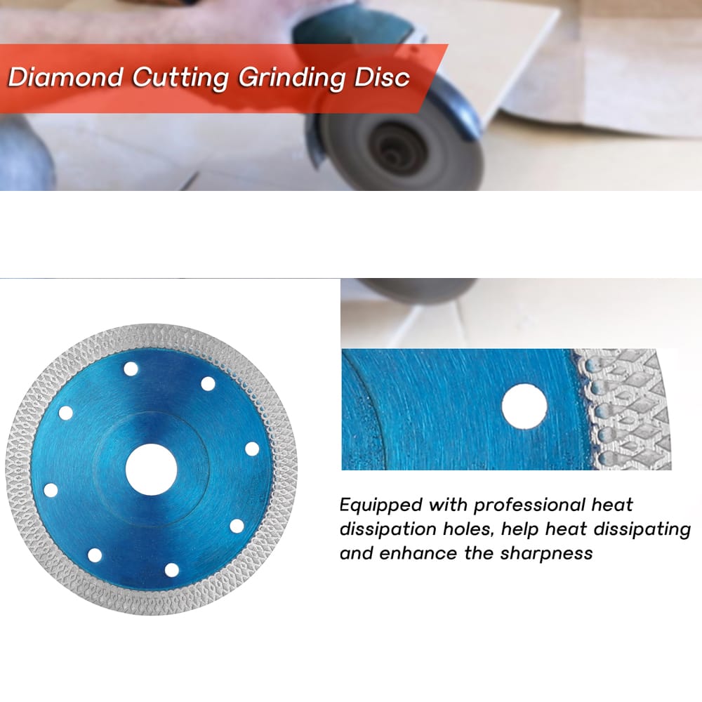 This is a kind of fine quality diamond cutting grinding disc suitable for both wet or dry working fine performance with water. Perfect for curve cutting shaping and removing deep scratches from stone prior polishing. High cutting performance in hard materials with a long service life. Suitable for granite marble natural and artificial stone concrete brick block. You can have a try.Features:105mm 115mm and 125mm optional you can choose according to your performance demands.Suitable for both wet or dry working fine performance with water.With high hardness not easy to broken and the bladeedge with long service time.Adopt hot-processing technology thin and smooth help saving materials while cutting.Equipped with professional heat dissipation holes help heat dissipating and enhance the sharpness.Which can help remove trashes effectively and reduce quantity of heat thus will improve it and polish will be more faster.With superior comprehensive ability not only can be used to polish rough surface but also can polish surface more smooth.Application: Hard material granite marble tile ceramic brick etc..Note: please wear protective product before use.Specifications:Name: Diamond Cutting Grinding DiscMaterial: metalColor: blueOuter diameter: 105mm 115mm 125mm (optional)Inner diameter: 22.23mmThinckness: 1.2mmPackage size:105mm: 105 * 105mm / 4.13 * 4.13in115mm: 115 * 115mm / 4.53 * 4.53in125mm: 125 * 125mm / 4.92 * 4.92inPackage weight:105mm: 110g / 3.88ounce115mm: 140g / 4.93ounce125mm: 160g / 5.64ouncePacking List:1 * Diamond Disc