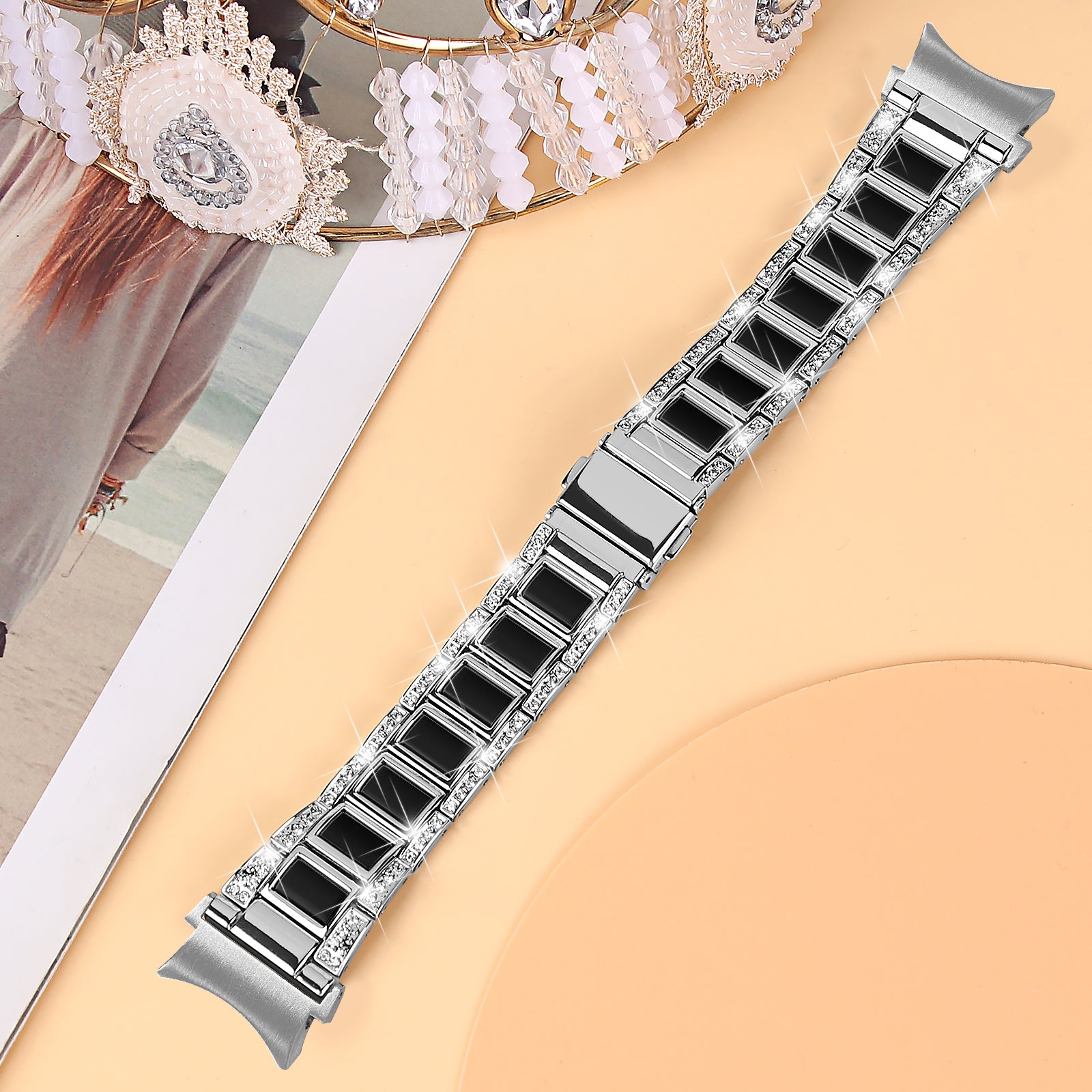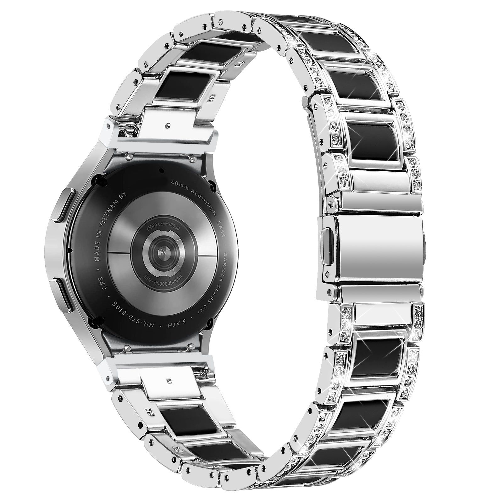For Samsung Galaxy Watch4 Active 40mm/44mm/Watch4 Classic 42mm/46mm Shiny Rhinestone Watch Strap Stainless Steel Resin Wrist Band Replacement - Silver/Black
