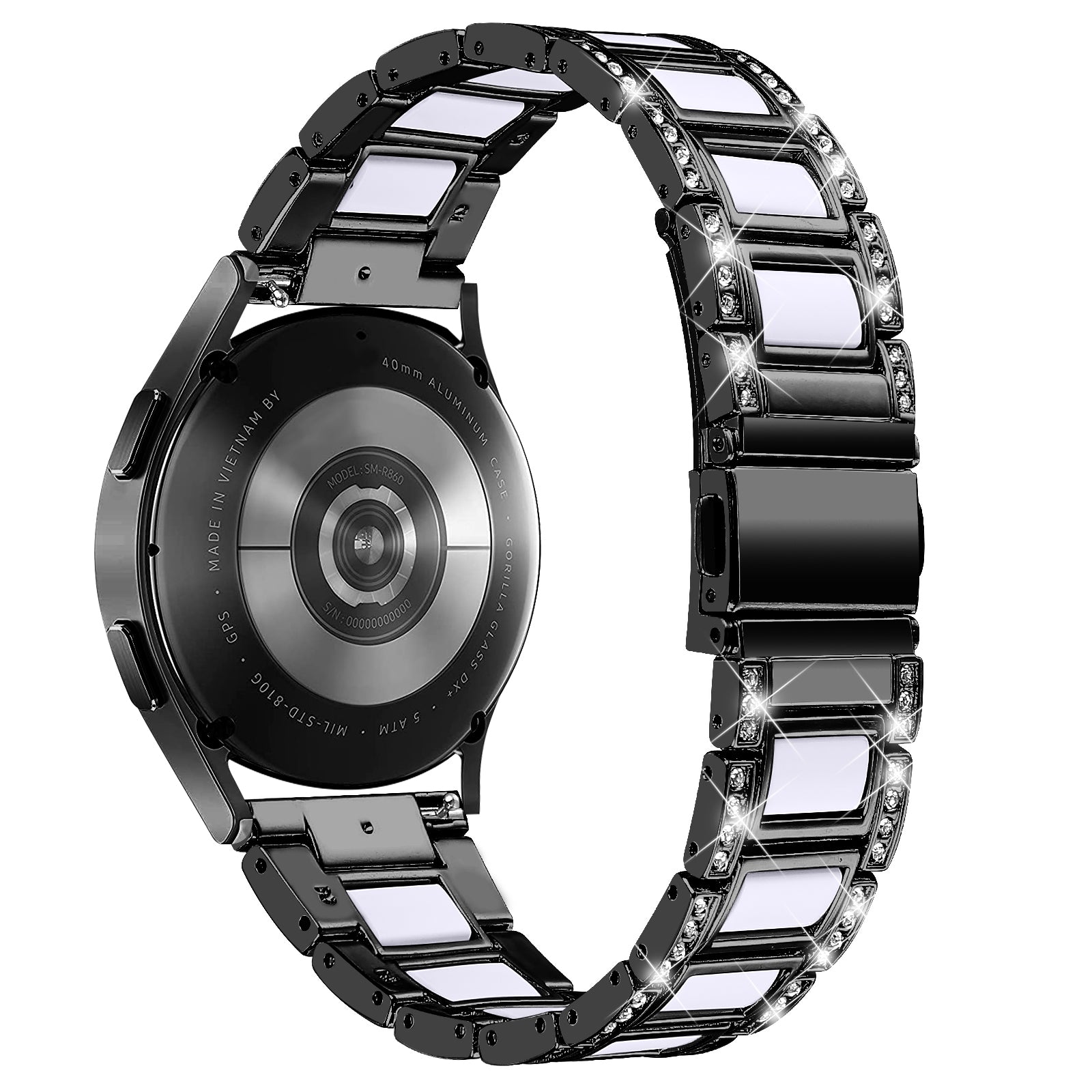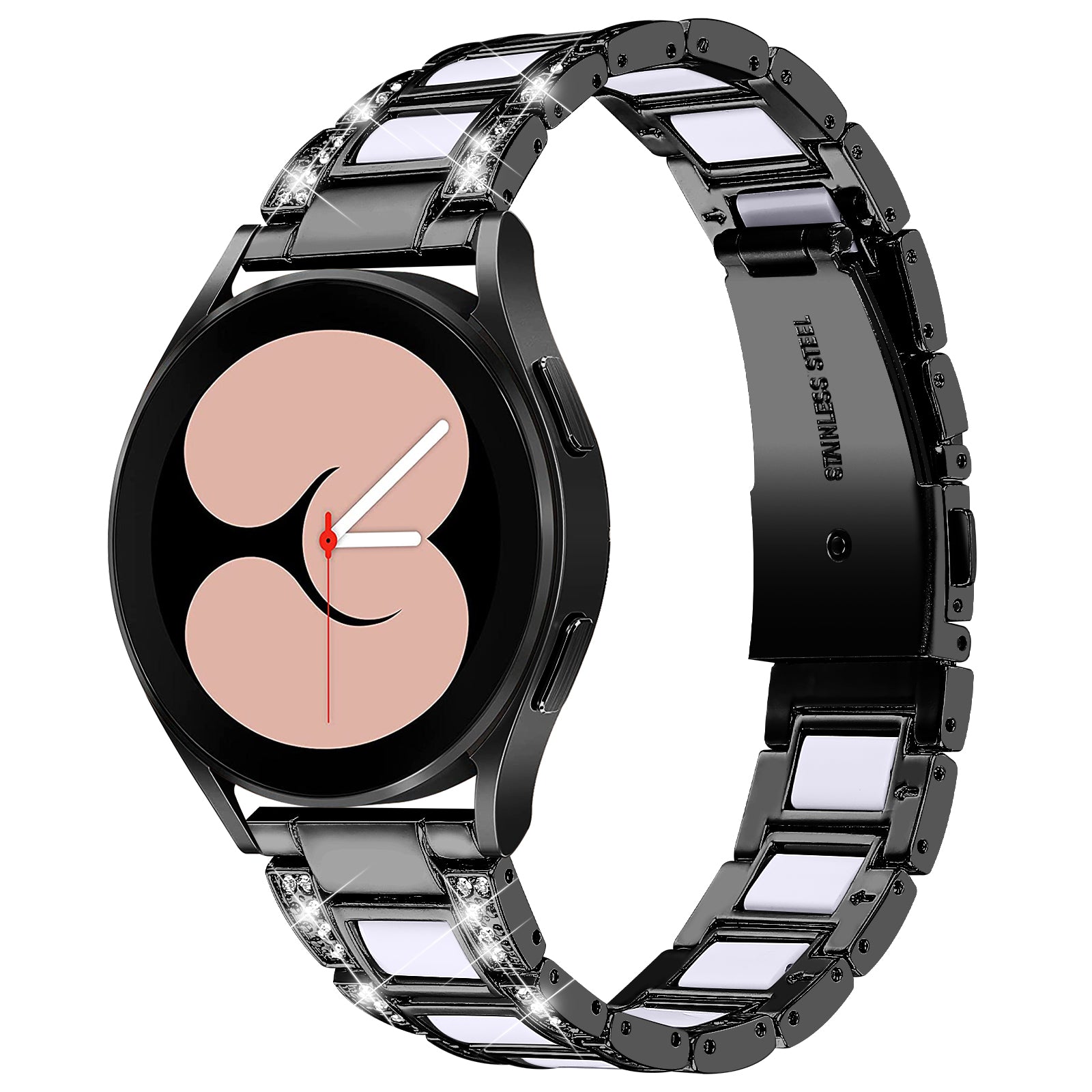 For Samsung Galaxy Watch4 Active 40mm/44mm/Watch4 Classic 42mm/46mm Stainless Steel Resin Watch Band Wrist Strap with Rhinestone Decor - Black/White