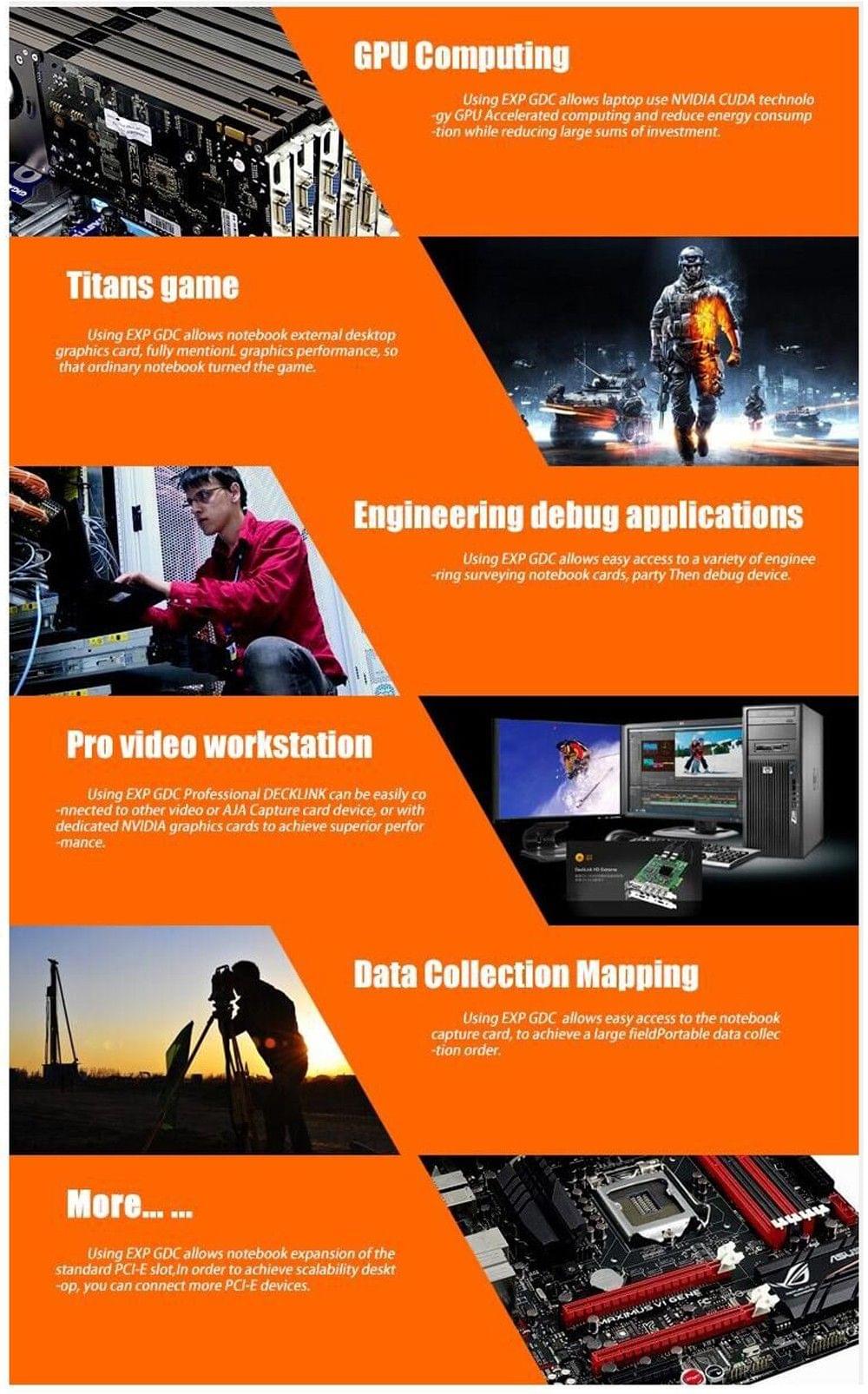 description":"This external Graphics dock is laptop external Graphics card transfer equipment, Exclusive Graphics Card. (Screen: Using your laptop's own monitor need laptop coming with graphics for Intel (R) HD and connected above GTS450 as NVIDIA graphics. Otherwise you need external monitor. Features: Dual TD compatible switch (hardware conflict resolution). Multistage anti interference circuit. Data line reinforcement. Multi power automatic switching (support for soft start). High quality imported electronic components. Double copper technology to enhance system power supply. Isolation protection circuit. LED status indicator. Lateral 6PIN power supply interface. Specifications: Color: Black Material: PC + PVC PCI-E: X1 DMI 5GT/s Input: MINI PCI-E / NGFF M.2 A/E Key / Expresscard (Optional) Power: ATX System: Win7/10 TD SW: 7s/15s Parts: ATX Power adapter cable Main Parameters: Support for PCI-E X16, the actual X1 mode (according to different notebook configuration can be upgraded to X4 mode) Basic Parameters: Products: Notebook PCI-E expansion device Product Positioning: Notebook performance upgrade. Operating System: Windows XP/7/8/8.1/10, MAC OS, Linux etc. (NOTE: for Win XP, Win8/8.1, it's only compatible with the laptop with external screen.) Input Interface: Mini PCI-E (WLAN\WWAN\DMC), Expresscard (34#/54#), NGFF (Slot A、E、M) Extended Support: PCI-E X16: DMI 5GT/s (X1) Compatible Brand: for Asus, GIGABYTE, MSI, GALAXY, Colorful, EVGA, etc Compatible Model: GTX650\GTX660\GTX670\GTX750\GTX760\GTX770\GTX950\GTX960\GTX970\GTX980\GTX1060\GTX1070\GTX1080 Power Support: 8P Interface: 220W max. DC Interface: 150W max. Note: the power limit without ATX cable. Item Size: 62 * 95 * 212mm / 2.44 * 3.74 * 8.35in Item Weight: 108g / 3.81oz (MINI PCI-E) 107g / 3.77oz (NGFF M.2 A/E Key) 123g / 4.34oz (Expresscard) Package Size: 18 * 10 * 6cm / 10.8 * 7.3 * 4.4in Package Weight: 166g / 5.86oz (MINI PCI-E) 165g / 5.81oz (NGFF M.2 A/E Key) 181g / 6.37oz (Expresscard) Package List: 1 * EXP GDCV8.0 PCI-E Adapter 1 * Mini PCI-E Data Lines 1 * ATX PSU Power Cable
