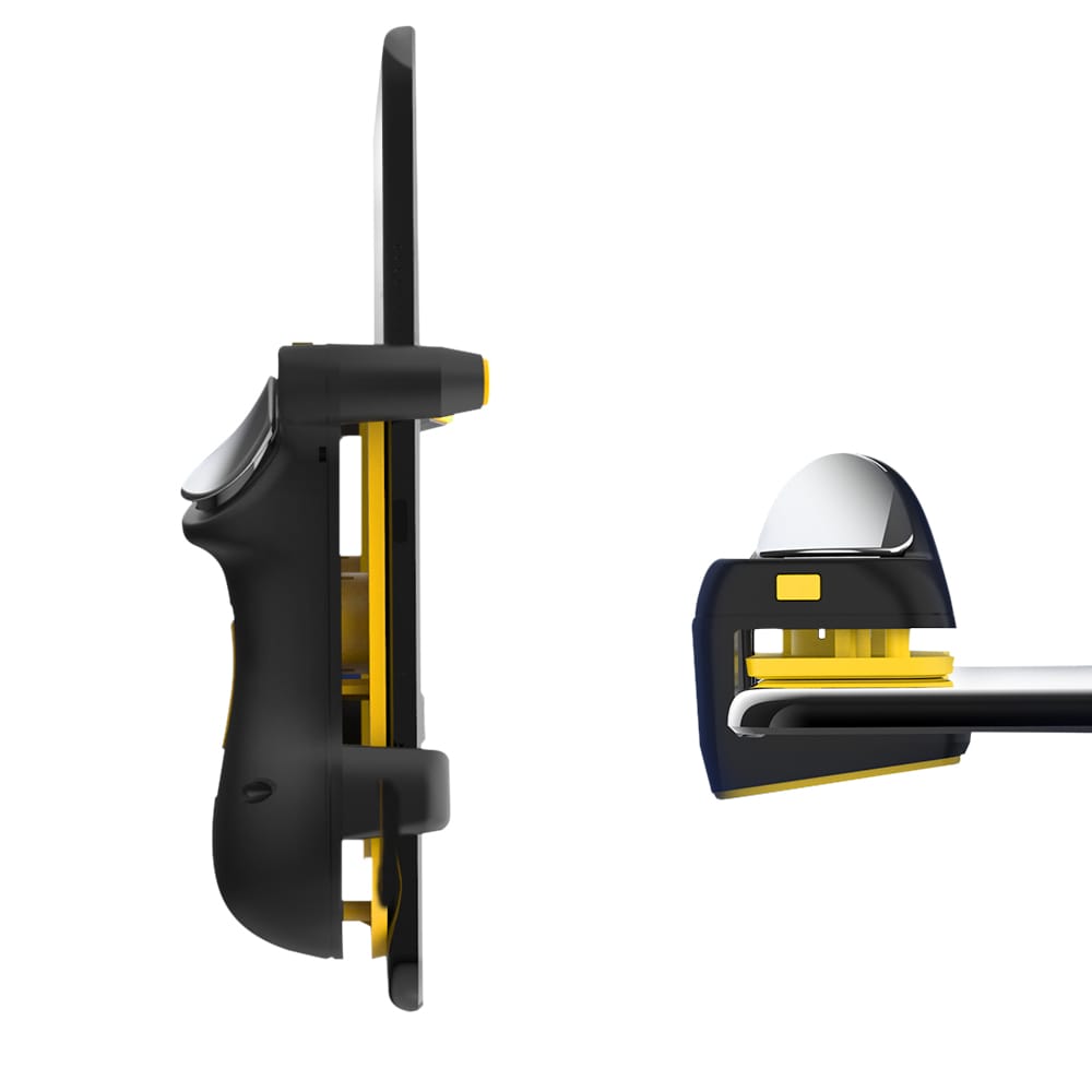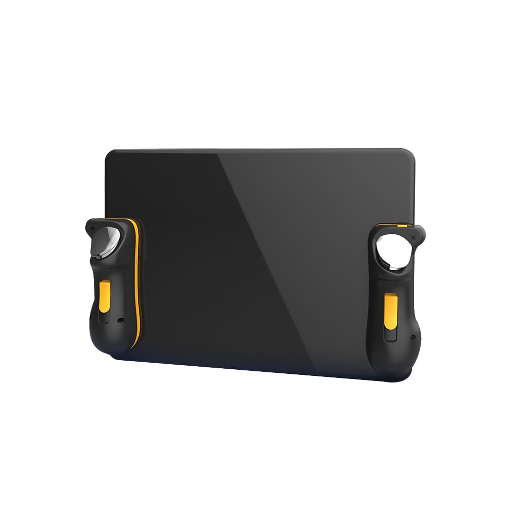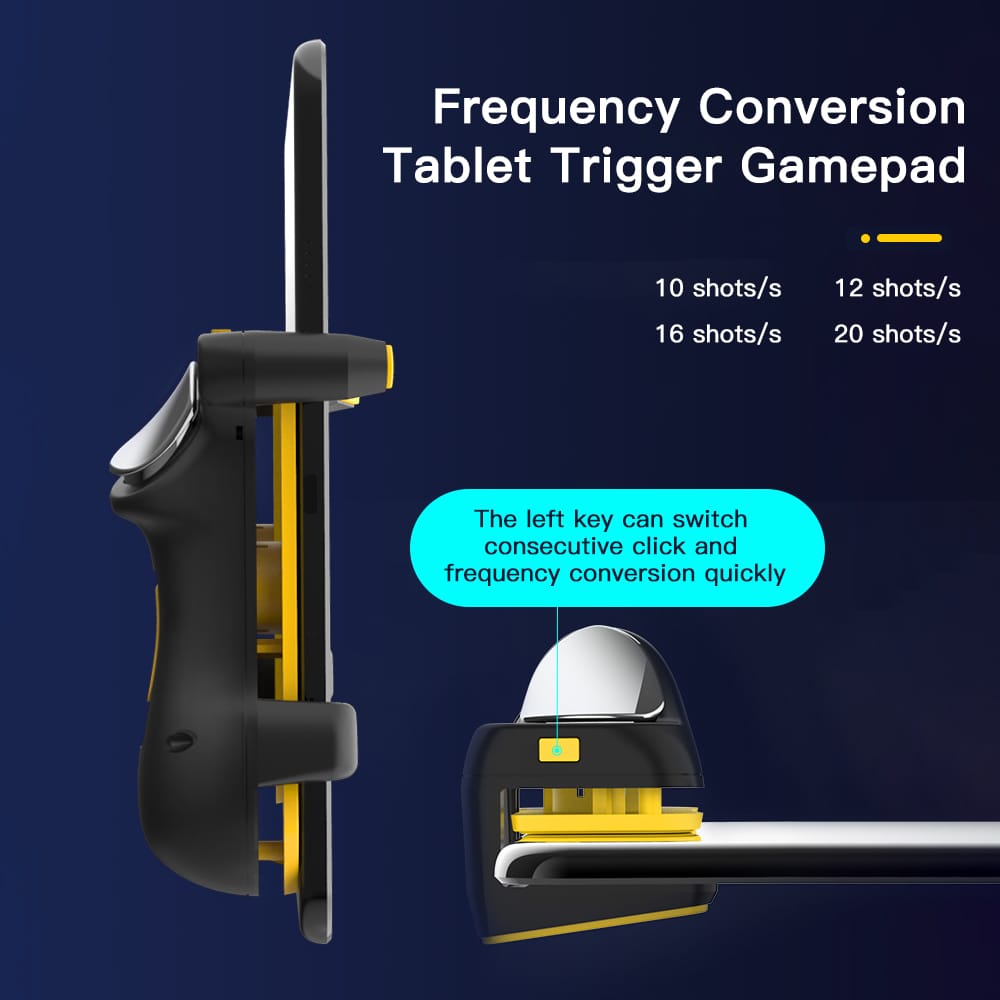 Features:Designed for games on iPad and Android tablet a perfect gift for players.The gamepad and ignition controller are integrated which has an ergonomic design to make your hand feel more comfortable. Playing mobile game with six fingers to push rotate aim and shoot at the same time and say goodbye to finger numbness. Four-gear frequency conversion rates give you great game experience.High-density conductive rubber and alloy buttons ensure speedy and sensitive response give you a real shooting experience.Separated button can be separated and can fit. No power supply and driver needed increases your in-game performance.Do not keep out the screen and interface not affect the game.Anti-slip silicone pad protection not hurt the tablet not easy to fall off.Specification:Item name: Tablet game triggerColor: Black+Yellow/Black+Orange(optional)Material: ABSPackage size: 13.3 * 11 * 5.5cm /5.24 * 4.33 * 2.17in(L * W * H)Package weight: 160g /5.64ozPackage list:1 * Tablet game trigger 1 * Charging cable
