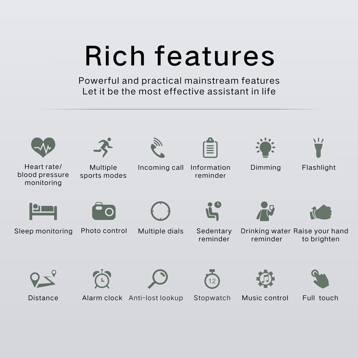 This smart watch has a full touch colorful screen and its various and practical functions let it be the most effective assistant in life.Parameters:Screen Type: 1.3 inch TFTScreen Operating Mode: Full touch screenBT Version: BT 4.2Compatible OS: Android IOSCompatability: Android 5.0 / iOS 9.0 and aboveType of Battery: Polymer lithium batteryBattery Capacity: 200mAhWater-resistant Level: IP67Standby time: About 8-10 daysCharging Time: About 2.5 hoursFeatures:Classic square screen for more information and a variety of fashion dials defined by yourself.Dynamic heart rate blood pressure monitoring real-time monitoring to protect your health.Call reminder and message notification let you no longer worry about missing information.Sleeping monitor let you know your sleep duration and quality remind you to keep scientific sleep.200mAh large capacity polymer battery daily use time up to 8 days.IP67 waterproof adapts to your daily needs.(don't put it into hot water and not fit for swimming)Multi-sport mode records health information calculates walking distance and calories burned and guides you to better achieve your health and fitness goals.Music control allows you to easily switch songs you want to listen to while exercising or running.Removable watchband and the milanese steel band is complimentary you can replace the watchband freely.Note:The music control function is limited to controlling local music playback use abroad is not supported for the time being.Specifications:Color: Black Blue Red Pink Dark Green (Optional)Watch Case: AlloyWatch Band: SiliconeMirror Material: IPS TP GlassCase Diameter: 3.44cm / 1.35inCase Thickness: 1.05cm / 0.41inBand Width: 2.0cm / 0.79inBand Length: 24.8cm / 9.76inWatch Weight: 46g / 1.62ozPackage Weight: 186g / 6.56ozPackage Size: 21 * 7.1 * 3cm / 8.27 * 2.80 * 1.18inWatch Language:Chinese English Japanese German French Italian Spanish Russian PortugueseApp Language:Chinese Simplified Chinese Traditional English German French Japanese Russian Spanish Italian Malay Portuguese Korean PolishFunctions:Time Alarm Clock Date Pedometer Stopwatch Notification of App Sedentary Reminder Measurement of Heart Rate Measurement of Blood Pressure Sleep Management Find Your Phone Call Reminder Steps Counting Distance Recording Multidial Replacement Bright Adjustment Camera Remote Control Music ControlPackage List:1 * Watch1 * Charging Line1 * Milanese Strap1 * User Manual( Multilingual)