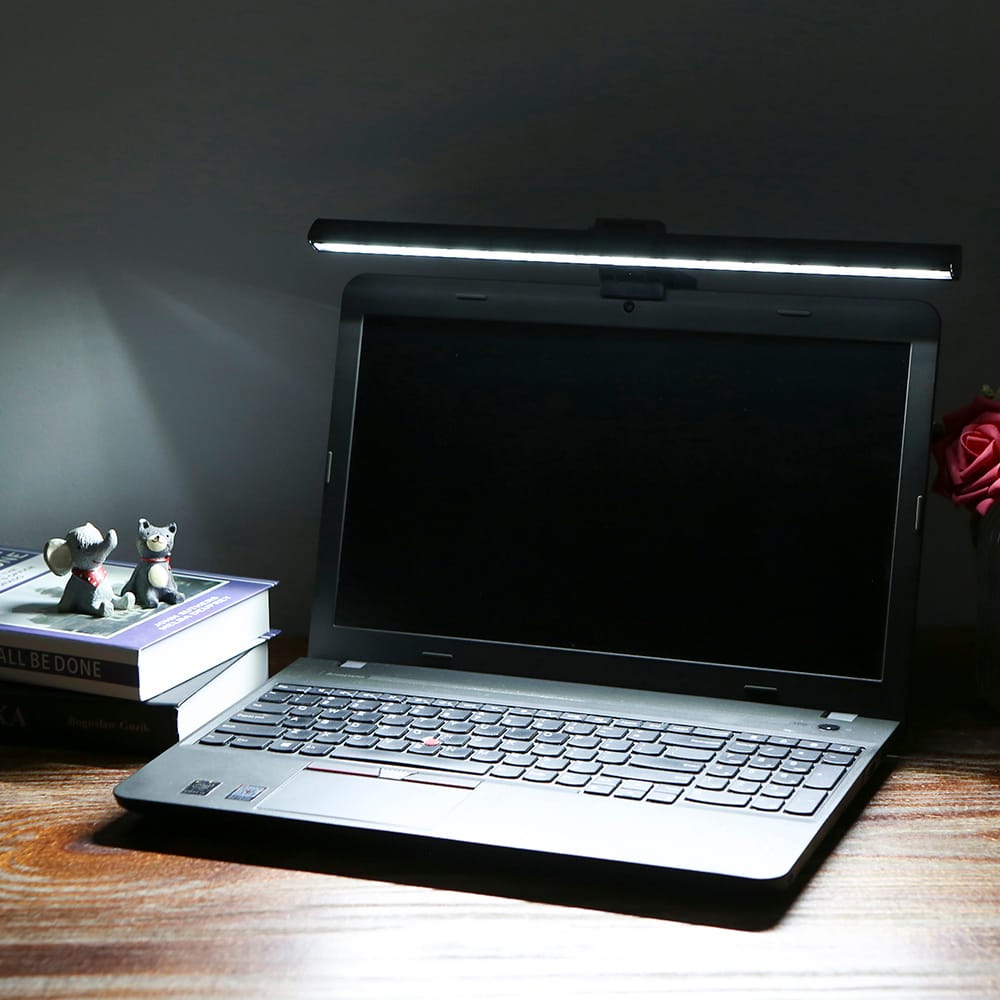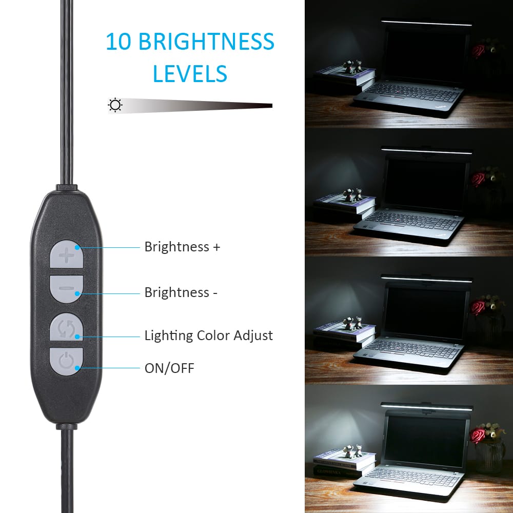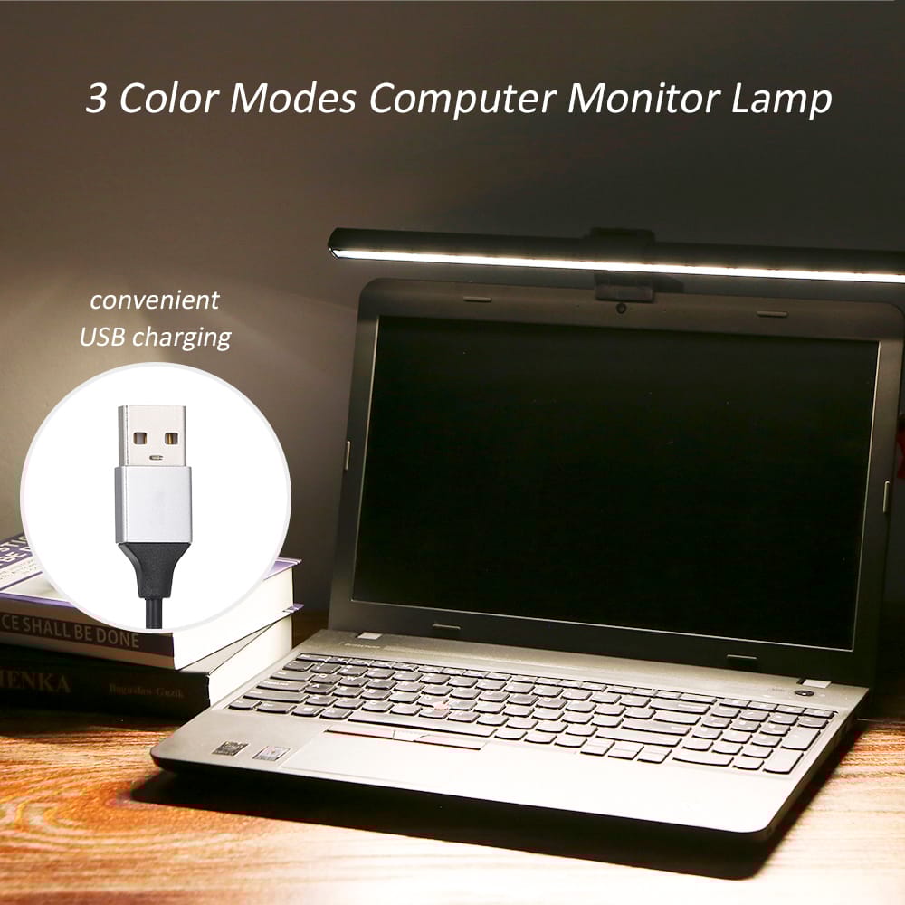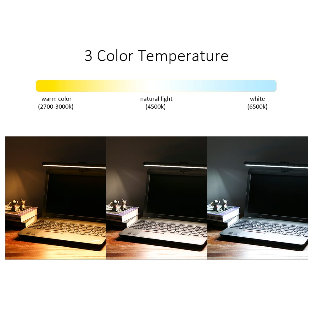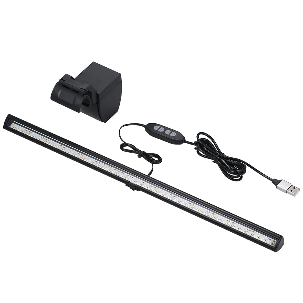 This bar light can be installed on computer monitors for lighting with color temperature and brightness adjustable can increase focus and comfort and to protect your eyes.Features:3 lighting color adjuatable and you can adjust the brightness to meet different needs.Adopts asymmetric light path design only illuminates the desktop space.Reduces screen reflection and effectively protects the eyes.USB powered easily charged by computer mobile phone adapter or a power-banks.Just clip the loght on top of the computer screen and do not need screws or tape.The stretchable holder can be applied to computer monitors with 10-35mm.Specifications:Material: ABS aluminumColor: blackInput: DC 5V 1-2ALight color: white(6500k) warm white(2700-3000k) natural light(4500k)Brightness: 10 levelsLuminous: 500lmLifespan: 50 000hCable length: 2.1m / 6.89ftLight length: 400mm / 15.748inPackage weight: 495g / 1.09lbPackage size: 435 * 135 * 50mm / 17.13 * 5.31 * 1.97inPackage List:1 * E-Reading Light1 * Holder1 * User Manual